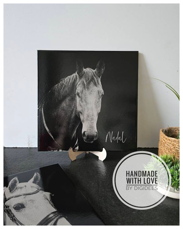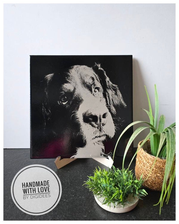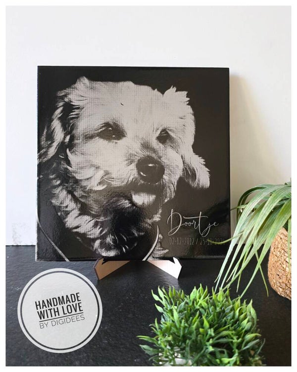 Gegraveerde Keramische tegel waar ik uw foto op graveer in zwart wit. Verkrijgbaar in 2 verschilllende formaten. Ik neem eerst contact met u op om een voorbeeld voor te leggen en om een en ander af te spreken alvorens ik aan het graveren ga.