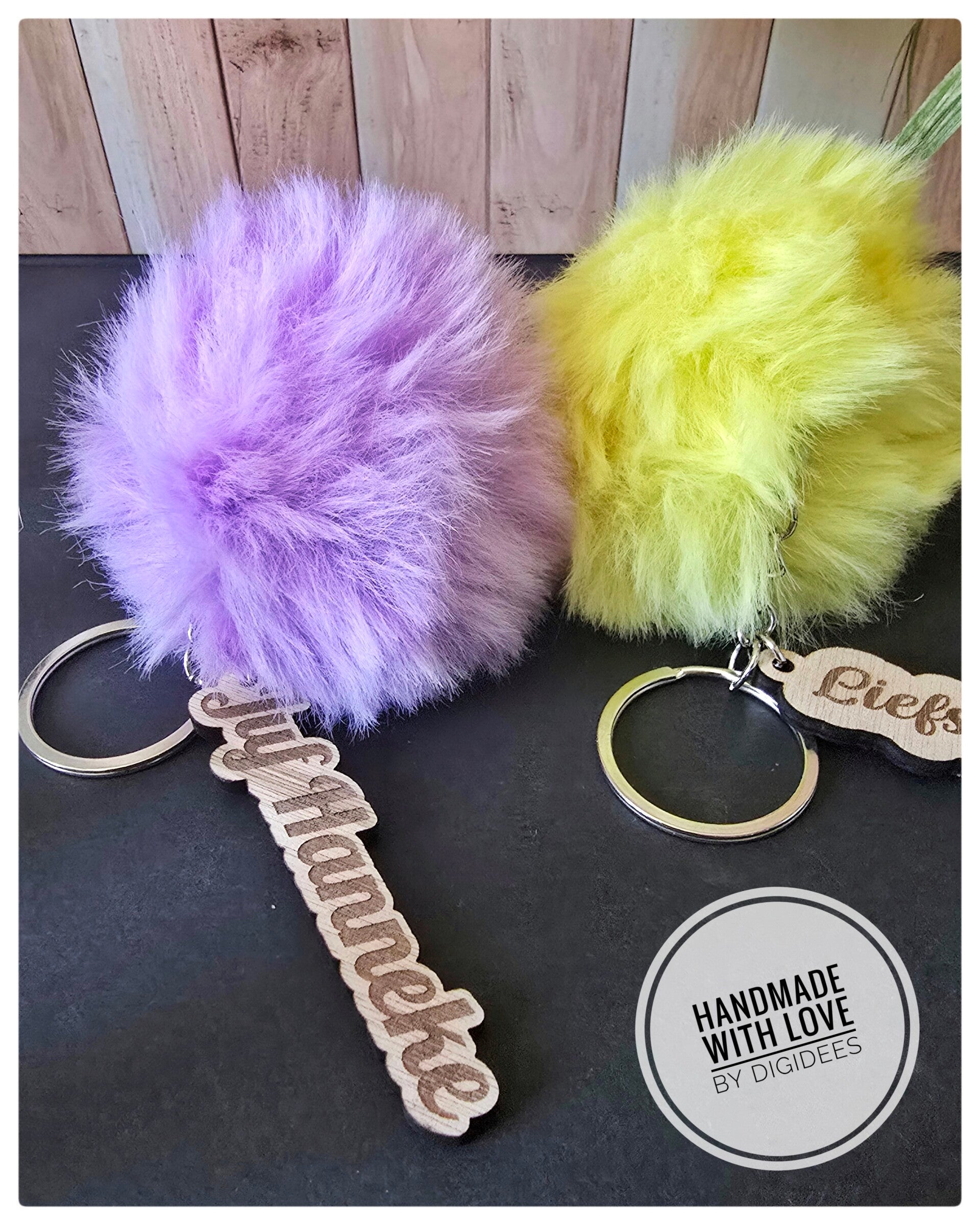 Deze handgemaakte sleutelhanger met een zachte fluffy pompon en houten naamlabel is een echte eyecatcher! 💖